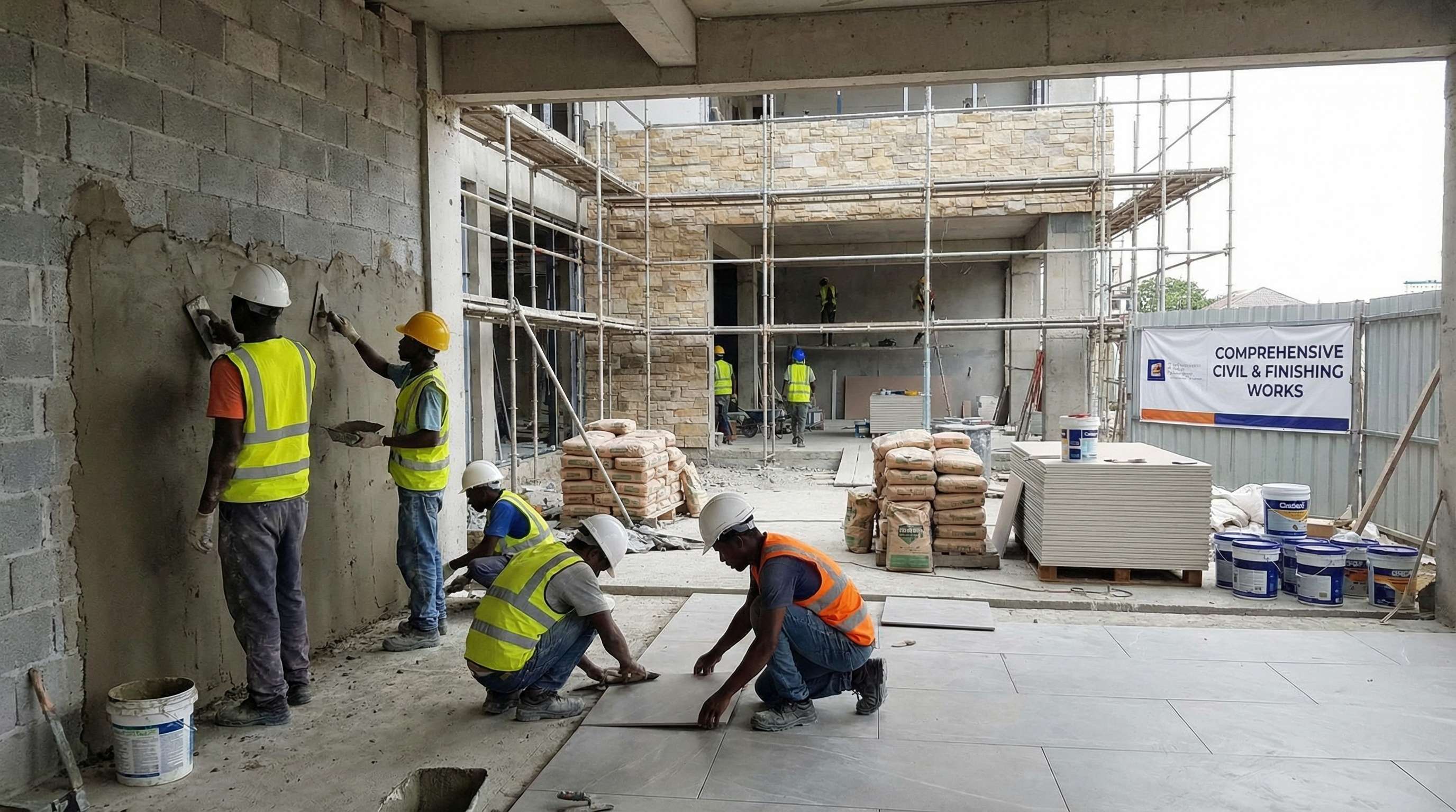 Comprehensive civil and finishing works forming the core of every interior fit-out. Our scope includes blockwork, plastering, screeding, tiling, stone works, flooring systems, ceiling frameworks, gypsum and feature ceilings, wall partitions, painting, waterproofing, and all preparatory works required to achieve high-quality finishes and long-term durability.